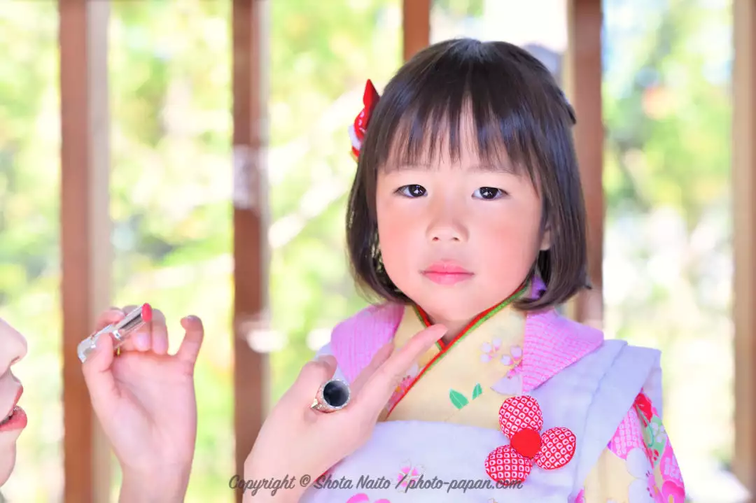七五三のお祝いで、口紅を塗ってもらう女の子の記念写真