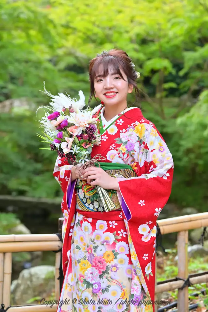 和ブーケを持つお振袖の女性、浜松城公園にて成人式前撮り